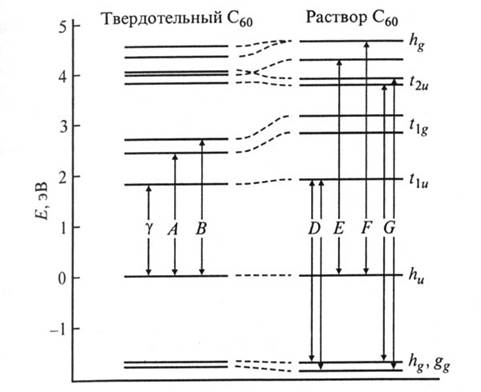 Рисунок 8. Схема энергетических уровней и возможных оптических переходов в пленках и растворах С60.