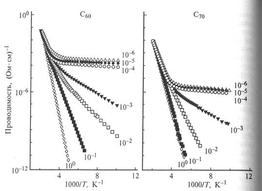 Вследствие высоких значений сопротивления фуллерита в большинстве своем присутствуют измерения для температур от комнатной и выше (см. рис. 9 ). Для поликристаллических пленок значения активационной энергии и темновой проводимости при комнатной температуре составляют соответственно 0.3— 0.6 эВ и 10^-6 - 10^-8 (Ом.см)^-1. Для аморфных пленок эти значения лежат в интервале 0.5 - 1.1 эВ и 10^-7 - 10^-144 (Ом.см)^-1.