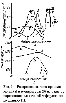 Характер распределения проводимости (а следовательно, и концентрации свободных электронов) по радиусу поперечных сечений пламени представлен на рис. 1. На этом же рисунке показано соответствующее распределение температуры.