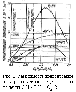 Концентрацию электронов определяли методом сопротивления фронта пламени. Некоторые результаты работы даны на рис.2, где концентрация электронов и температура пламени даны в функции соотношения С2Н2/С2Н2+О2 при двух концентрациях азота (71 и 76%). Концентрация электронов по рассмотренным режимам менялась в пределах 1010 - 1011 см-3, причем ее максимальное значение соответствовало максимальной скорости горения.