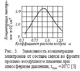 Важные результаты получены Иноземцевым [3] по исследованию влияния различных факторов на ионообразование в пламенах смесей с воздухом пропана и бензина. На рис. 3. приведены результаты измерения концентрации электронов двойным зондом в зависимости от коэффициента избытка воздуха во фронте горения углеводородного топлива. Пламя горит при атмосферном давлении без предварительного подогрева горючей смеси.