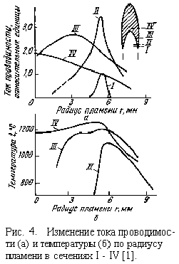 Сопоставляя характер изменения проводимости и температуры, интересно отметить, что максимальный ток проводимости располагается в районе сечения III, после чего проводимость резко снижается. Если бы причиной ионизации были случайные примеси легкоионизируемых элементов, то подобный характер изменения должна была бы иметь и температура. Однако температура по высоте пламени непрерывно растет вплоть до последнего сечения VI.
