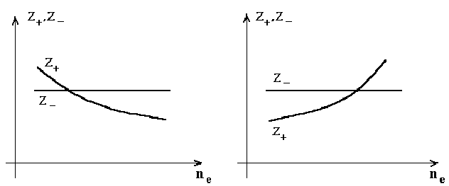 Об устойчивости стационарного состояния можно судить по взаимному расположению кривых в его окрестности. Если при ne>ne(0) Z- проходит выше, а при ne<ne(0) - ниже (кривой рождения рис. 6 а.), состояние устойчиво, ибо при случайном отклонении от равновесия система к нему возвращается. В противном случае (рис. 6 б) состояние неустойчиво: при случайном возрастании ne рождение становится больше гибели и число электронов увеличивается еще сильнее.