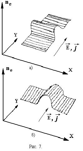 Цепочки причинных связей между различными процессами при развитии возмущений и их конечный результат зависят от ориентации неоднородностей по отношению к направлениям электрического тока и поля. Если ne меняется вдоль направления Е, в результате нарастания таких продольных возмущений ne (рис. 7а) образуются страты. В результате нарастания поперечных возмущений (рис. 7б) происходит контракция и образуются шнуры с резко повышенной плотностью электронов -вдоль них и течет ток. В трубках плазма стягивается к оси, а в