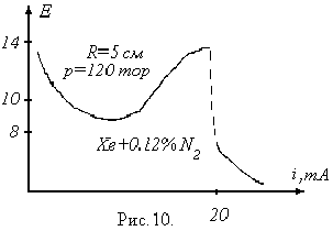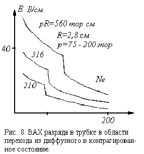 Левая часть ВАХ до скачка соответствует диффузному разряду, ne~J0(2,4r/R). При критическом значении тока поле и напряжение скачком уменьшаются, чему соответствует скачкообразный переход однородного столба в контрагированную форму (см. рис. 8). У оси появляется светящийся шнур, а остальная часть трубки темнеет neкрит(0)~1011 см-3.