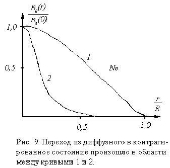 Гибель электронов должна иметь объемный характер, причем быть достаточно быстрой, чтобы будучи рожденным в шнуре, электрон не мог далеко продиффундировать от него в сторону. Электроны обязаны гибнуть недалеко от места рождения. По этой причине контракция возникает только при достаточно сильных токах и больших ne, когда объемная рекомбинация преобладает рекомбинацией на стенках.
