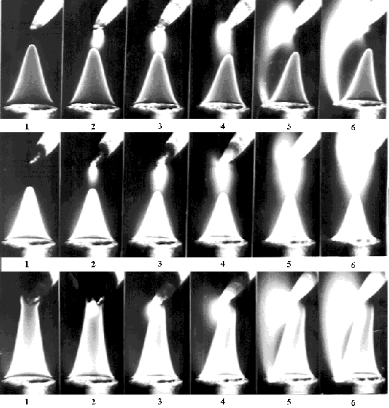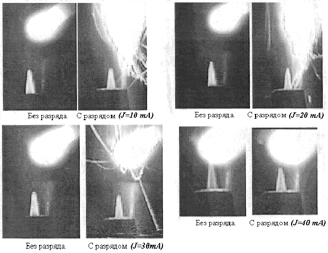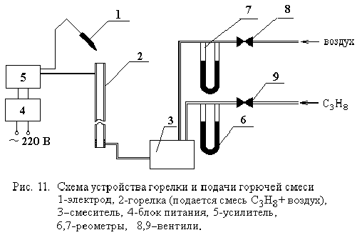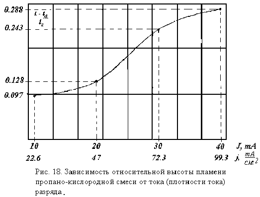 Эксперименты проводились с предварительно перемешанными пропановоздушными и пропанокислородными смесями на медной горелке диаметром 0,6 см. Электрический разряд зажигался между горелкой и вольфрамовым электродом, помещенным на вершине конуса пламени (см. рис.11). Холостое выходное напряжение источника равнялось 5 кВ. Значение тока разряда поддерживалось на заданном уровне, а напряжение менялось в пределах 2 - 2,5 кВ.