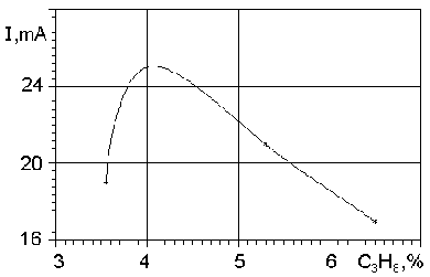 В случае горения пропана ионизационный ток пламени заметно убывает по мере удаления от точки зажигания. Что касается температуры пламени, то она непрерывно возрастает по мере удаления от точки зажигания.