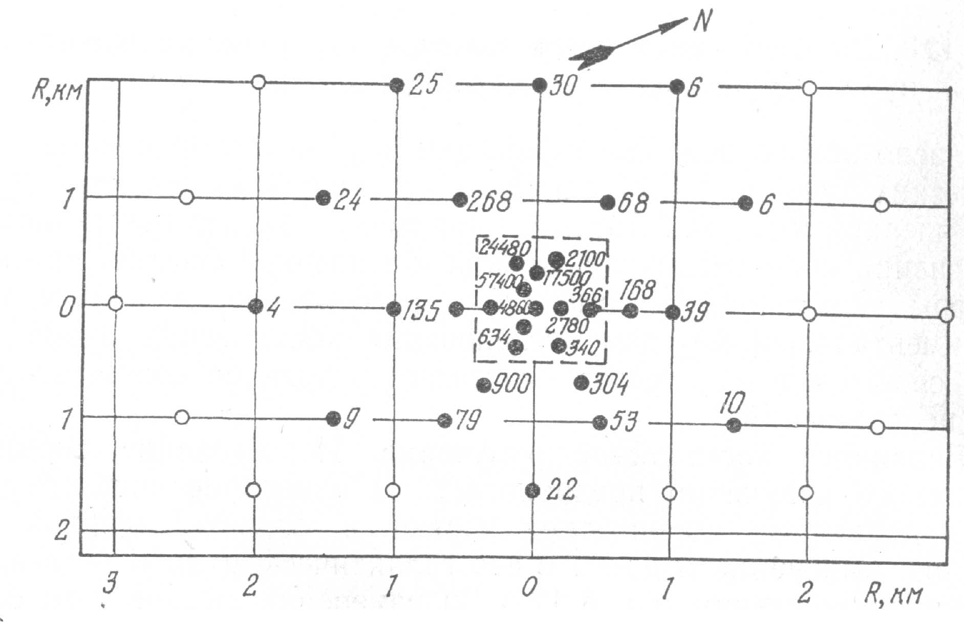Якутская комплексная установка ШАЛ Института космофизических исследований и аэрономии Якутского филиала Сибирского отделения АН СССР имеет площадь 18 км2, на которой размещены 172 пластмассовых сцинтилляционных детектора площадью 2 м2 каждый. Регистрируются ШАЛ с энергией 1017—1020 эВ. На рис. 1 приведен план размещения сцинтилляционных детекторов на Якутской установке, где отмечены детекторы, зарегистрировавшие прохождение частиц одного из ШАЛ.