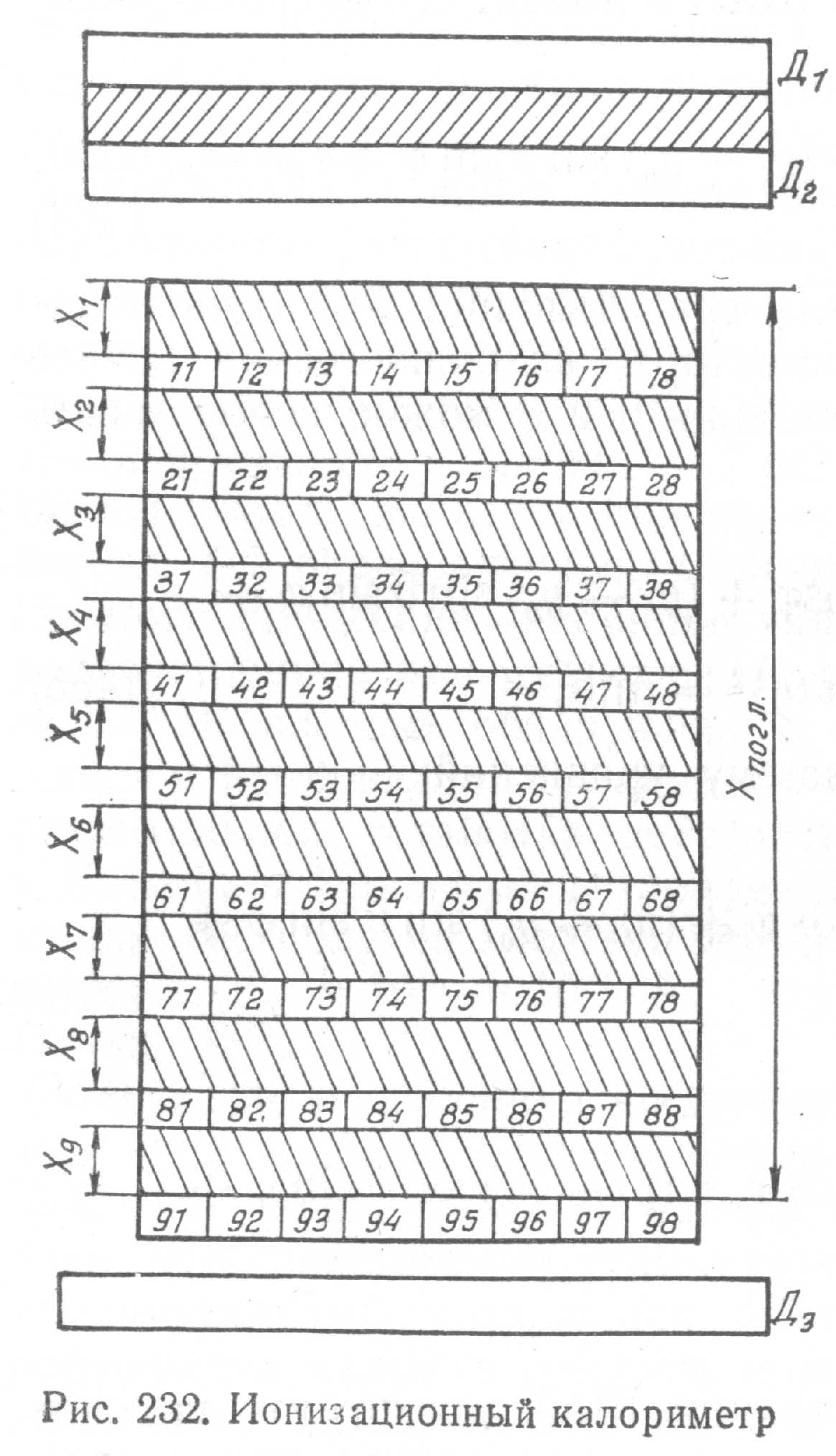 Здесь S1 и S2 — площади верхнего и нижнего оснований калориметра, h — расстояние между ними. Следует стремиться к максимальной величине светосилы, но без ущерба для остальных характеристик калориметра. Оптимальным веществом для поглотителя калориметра являются железо (Fe), латунь, медь (Сu), которые имеют значительную плотность и средний порядковый номер, что обеспечивает сравнительно небольшие размеры, высокую светосилу и хорошее пространственное разрешение калориметра при минимальном числе детекторов ионизации. Наилучшим детектором ионизации в калориметрах является ионизационная камера. Ее достоинства: