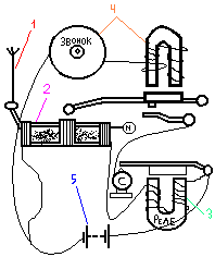 1 – антенны, 2 – когерера, 3 – электромагнитного реле, 4 – электрического звонка, 5 – источника постоянного тока. Электромагнитные волны вызывали вынужденные колебания тока и напряжения в антенне. Переменное напряжение с антенны подавалось на два электрода, которые были расположены в стеклянной трубке, заполненной металлическими опилками. Эта трубка и есть когерер. Последовательно с когерером включались реле и источник постоянного тока.