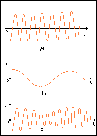 Переменное напряжение звуковой частоты складывается с постоянным напряжением источника тока; изменения напряжения между эмиттером и коллектором транзистора приводят к изменениям со звуковой частотой амплитуды колебаний силы тока высокой частоты в контуре генератора. Такие колебания высокой частоты называются амплитудно-модулированными.