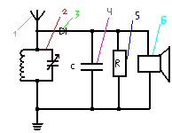 Электромагнитные волны, излучённые антенной радиопередатчика, вызывают вынужденные колебания свободных электронов в любом проводнике. Напряжение между концами проводника, в котором электромагнитная волна возбуждает вынужденные колебания электрического тока, пропорционально длине проводника. Поэтому для приёма электромагнитных волн в простейшем детекторном радиоприёмнике применяется длинный провод – приёмная антенна (1). Для того чтобы слушать только одну радиопередачу, колебания напряжения не направляют непосредственно на вход усилителя, а сначала подают на колебательный контур (2) с изменяющейся собственной частотой колебаний. Изменение собственной частоты колебаний в контуре приёмника производится обычно изменением электроёмкости переменного конденсатора. При совпадении частоты вынужденных колебаний в антенне с собственной частотой контура наступает резонанс, при этом амплитуда вынужденных колебаний напряжения на обкладках конденсатора контура достигает максимального значения. Таким образом, из большого числа электромагнитных колебаний, возбуждаемых в антенне, выделяются колебания нужной частоты. С колебательного контура приёмника модулированные колебания высокой частоты поступают на детектор (3). В качестве детектора можно использовать полупроводниковый диод, пропускающий переменный ток высокой частоты только в одном направлени. В течении каждого полупериода высокой частоты импульсы тока заряжают конденсатор (4), вместе с тем конденсатор медленно разряжается через резистор (5). Если значения электроёмкости конденсатора и электрического сопротивления резистора выбраны правильно, то через резистор будет протекать ток, изменяющийся во времени со звуковой частотой, использованной при модуляции колебаний в радиопередатчике. Для преобразования электрических колебаний в звуковые переменное напряжение звуковой частоты подаётся на телефон (6).