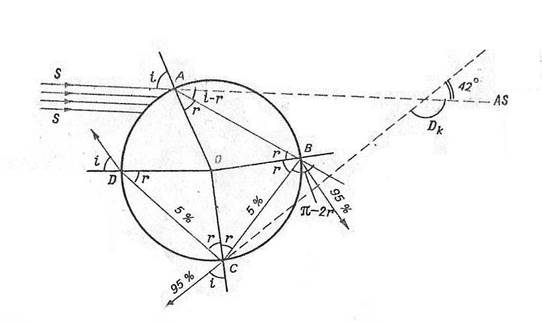 Рис. 1. Ход светового луча в капле при образовании первой и второй радуг.