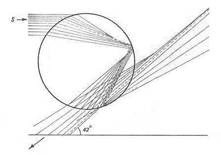 Каждый белый луч, преломляясь в капле, разлагается в спектр, и из капли выходит пучок расходящихся цветных лучей. Поскольку у красных лучей показатель преломления меньше, чем у других цветных лучей, то они и будут испытывать минимальное отклонение по сравнению с остальными. Минимальные отклонения крайних цветных лучей видимого спектра красных и фиолетовых оказываются следующими: D1k = 137°30' и D1ф = 139°20'. Остальные цветные лучи займут промежуточные между ними положения.