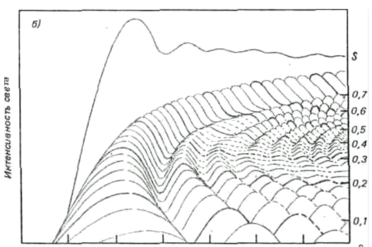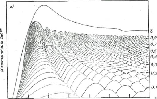 Сложная волнообразная поверхность на переднем плане (рис.3 а ) составлена из многих индивидуальных кривых. Каждая кривая дает распределение и интенсивность света в радуге от одной капли. Каждая пятая кривая проведена потолще, цифры справа означают радиус капли, соответствующей кривой, в миллиметрах. Все кривые начинаются слева с очень малой интенсивности (вне радуг), затем быстро поднимаются до максимума между 138° и 139° (первая радуга). Следующий гребень справа — первая дополнительная дуга, за ней вторая дополнительная дуга и т. д. Расстояние между дугами, как видно из рисунка, быстро уменьшается при увеличении радиуса капель. Это действие первого фактора. Радуга становится узкой при увеличении размера капель.