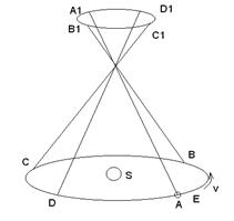 В четырехмерном мире, или в пространстве - времени множество точек, удаленных от начала координат на нулевое “расстояние”, образуют конус, осью которого является ось времен. Конус называется световым. Точки, расположенные внутри светового конуса, имеют отрицательные квадраты релятивистского интервала до начала координат. Точки, расположенные вне светового конуса, имеют положительные квадраты релятивистского интервала до начала координат.