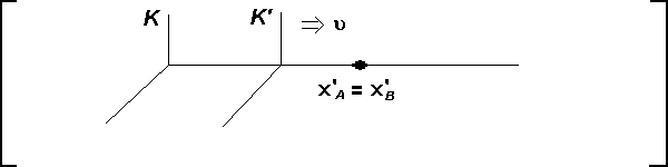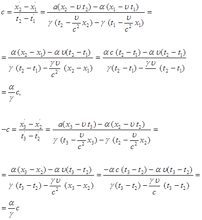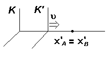 Чтобы найти числа a’ и a , выставим ещё одно требование. Обратим внимание, что пока мы до конца не условились о выборе основных единиц измерения длинны и времени в системах отсчета K и K ’ . Разумеется, отчасти этот выбор уже был выше ограничен требованием, чтобы скорость света в обеих системах отсчёта давалась одним и тем же числом c , которое мы учли, т.е. мы уже согласовали отчасти единицы измерения скоростей в системах K и K’. Но единица скорости есть только отношение единиц длины и времени. Поэтому остаётся произвол в выборе единицы измерения либо длины, либо времени. Фиксируем теперь окончательно этот произвол с помощью следующего требования.