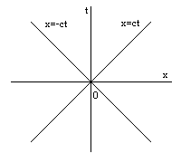 В отличие от квадрата расстояния между двумя точками в обычном трехмерном пространстве, который всегда положителен при несовпадающих точках и равен нулю при совпадающих точках, квадрат релятивистского интервала может быть как положительным, так и отрицательным. В четырехмерном мире имеются пары несовпадающих точек, “расстояния” между которымиравно нулю. Например, рассмотрим геометрическое место точек, лежащих на плоскости xt, от начала координат на нулевое “расстояние”. Для них имеем условие