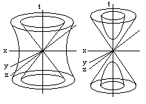Множество точек, для которых квадрат интервала s2 от начала координат 0 положителен и постоянен, образует однополостный гиперболоид, окружающий световой конус.