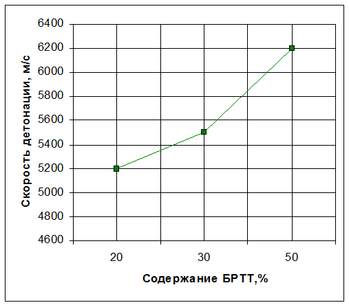 Скорость детонации ЭВВ, содержащего 20% крошки БРТТ типа РСТ-4к составляет 5200 м/с, а при содержании крошки РСТ-4к равном 50 % скорость детонации данного ВВ достигает 6200 м/с, что существенно выше скорости детонации акватола Т-20ГК.