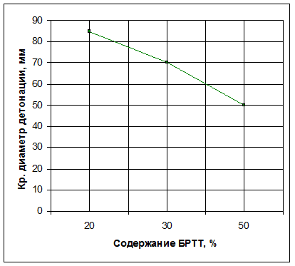 Для зарядов ЭВВ с различным содержанием утилизируемых компонентов по методу цилиндрических зарядов был определен критический диаметр детонации (dкр ). Результаты определения критического диаметра детонации представлены в табл. 2. Зависимость критического диаметра детонации от содержания БРТТ представлена на рис.4.