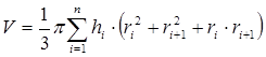 Объем воронки вычисляется как сумма объемов элементарных усеченных конусов: