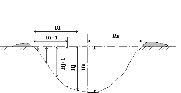 | Расстояние по профилю воронки ri , см | Глубина по профилю воронки hi , см | ||||