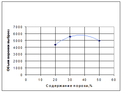 Зависимость объема воронки выброса от содержания утилизируемого пороха показана на рис.8. (эмульсия + РСТ-4к).