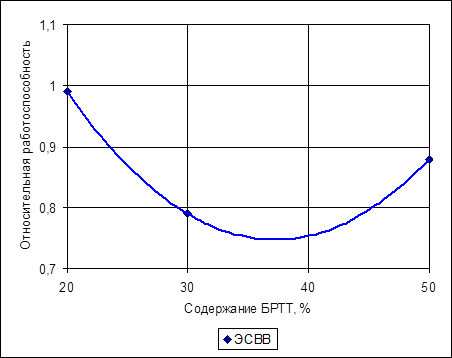 Рис.10. Зависимость относительной работоспособности ЭВВ от содержания БРТТ