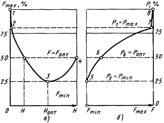 Применяя МИО, можно значительно уменьшить избыточную энергию материала, связанную с концентрацией внутренних и поверхностных напряжений в конкретной детали, и снизить до минимума вероятность ее поломки. Изменения избыточной энергии поля при МИО стальных деталей (или заготовок) показаны на рис. 1, а , точки 1 — 4. Для каждого материала (и детали) существует оптимальное значение внешнего импульсного магнитного поля Hопт . при котором концентрация напряжений в материале, а следовательно, и избыточная энергия F предельно уменьшаются (F → Fmin) , вследствие чего повышается надежность детали. Вероятность разрушения детали (рис. 1, б, точка 5) не превышает 0,25, что гарантирует нормальную работу механизма.