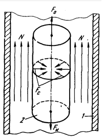 трорежущих сталей, а также для деталей из конструкционных и легированных сталей продолжительность одного цикла магнитной обработки не превышает 1,0 ... 5,0 с. При этом в магнитном поле средней напряженности за период импульса 0,5 ... 1,0с цилиндрический инструмент (или деталь) подвергается "винтовому сжатию". Возникающие электродинамические силы частично уплотняют кристаллиты сплава, вследствие чего снижаются концентрации напряжений. Схема электродинамических сил, действующих в полости индуктора на тело концевого