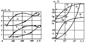 Опыты показали, что при намагничивании необязательно материал детали доводить до насыщения. Для технологических целей достаточно намагнитить до 10 ... 50% магнитного насыщения конкретной стали. Изучение влияния магнитного поля на кривые фазовых переходов при охлаждении стали показало, что при наложении поля переориентация кристаллитов термообработанных образцов ускоряется почти в 2 раза. Испытания проводились на образцах из быстрорежущей стали диаметром 10 мм по методике Уральского научного центра АН СССР. Образцы режущего инструмента намагничивались на установке УМОИ-50. Обработку образцов проводили со стороны северного полюса соленоида установки. Длительность импульса при МИО составляла 1 с при напряженности поля 1600 кА/м. После МИО образец инструмента выдерживался 20 ч на изолированных стеллажах в спокойном состоянии. Относительное удлинение ∆l/l образца и площадь петли гистерезиса S, связанной с фазовыми превращениями в твердом состоянии и изменениями в образцах избыточной энергии, определялись после МИО и выдержки. Изменение относительного удлинения образцов сверл диаметром 10 мм из стали Р6М5, не обработанных и обработанных магнитным полем напряженностью 1000 кА/м, в зависимости от температуры термодинамических превращений показано на рис. 3.