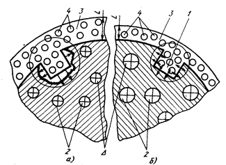 . 1 - микротрещины, заполненные намагничен ными частичками и скоагулированными продуктами износа детал и; 2 - "тепловые трубки", определяющие скорость охлаждения детали (поле скорости охлаждения); 3 — область активного смазывания детали в узле трения скольжения; L — толщина слоя смазывания; 4 - тонкодисперсные скоагулированные магнитным полем продукты износа деталей