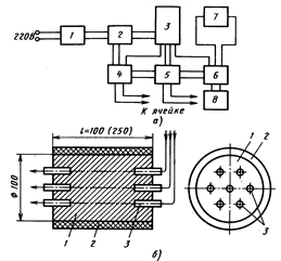 1 - стальной образец; 2 - цилиндр из изолирующего материала (стекла или керамики); 3 - датчики (7 шт.) для измерения параметров