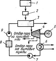 Теплоэлектроцентраль отличается от конденсационной станции установленной на ней специальной теплофикационной турбиной с отбором пара. На ТЭЦ одна часть пара полностью используется в турбине для выработки электроэнергии в генераторе 5 и затем поступает в конденсатор 6, а другая, имеющая большую температуру и давление (на рис. штриховая линия), отбирается от промежуточной ступени турбины и используется для теплоснабжения. Конденсат насосом 7 через деаэратор 8 и далее питательным насосом 9 подается в парогенератор. Количество отбираемого пара зависит от потребности предприятий в тепловой энергии.