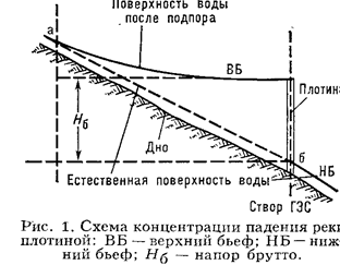 Напор ГЭС создается концентрацией падения реки на используемом участке плотиной(рис1), либо дерива