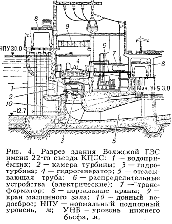 меру, гидротурбину, отсасывающую трубу, а по спец. водоводам между соседними турбинными камерами производится сброс паводковых расходов реки. Для русловых ГЭС характерны напоры до 30—40 м к простейшим русловым ГЭС относятся также ранее строившиеся сельские ГЭС небольшой мощности. На крупных равнинных реках основное русло перекрывается земляной плотиной, к которой примыкает бетонная водосливная плотина и сооружается здание ГЭС. Такая компоновка типична для многих отечественных ГЭС на больших равнинных реках. Волжская ГЭС им. 22-го съезда КПСС— наиболее крупная среди станций руслового типа.