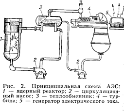 Принципиальная схема АЭС с ядерным реактором, имеющим водяное охлаждение, приведена на рис. 2. Тепло, выделяется в активной зоне реактора, теплоносителем вбирается водой (теплоносителем) 1-г контура, которая прокачивается через реактор циркуляционным насосом г Нагретая вода из реактора поступав в теплообменник (парогенератор) 3, где передаёт тепло, полученное в реакторе воде 2-го контура. Вода 2-го контура испаряется в парогенераторе, и образуется пар поступает в турбину 4.