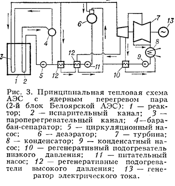 В зависимости от вида и агрегатного состояния теплоносителя создается тот или иной термодинамический цикл АЭС. Выбор верхней температурной границы термодинамического цикла определяется максимально допустимой темп-рой оболочек тепловыделяющих элементов (ТВЭЛ), содержащих ядерное горючее, допустимой темп-рой собственно ядерного горючего, а также свойствами теплоносителя, принятого для данного типа реактора. На АЭС. тепловой реактор которой охлаждается водой, обычно пользуются низкотемпературными паровыми циклами. Реакторы с газовым теплоносителем позволяют применять относительно более экономичные циклы водяного пара с повышенными начальными давлением и темп-рой. Тепловая схема АЭС в этих двух случаях выполняется 2-контурной: в 1-м контуре циркулирует теплоноситель, 2-й контур — пароводяной. При реакторах с кипящим водяным или высокотемпературным газовым теплоносителем возможна одноконтурная тепловая АЭС. В кипящих реакторах вода кипит в активной зоне, полученная пароводяная смесь сепарируется, и насыщенный пар направляется или непосредственно в турбину, или предварительно возвращается в активную зону для перегрева.