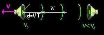Поскольку знаменатель дроби больше единицы, мы имеем ¦`<¦. Например, если источник создаёт звук на частоте 400 Гц, когда он находится в покое, то, когда источник начинает двигаться в направлении от наблюдателя, стоящего на месте, со скоростью 30 м/с, последний услышит звук на частоте (при температуре 0 о C)