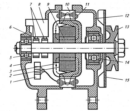 В крышке 4 со стороны контактных колец установлены пластмассовый щеткодержатель 8 с двумя прямоугольными меднографитовыми щетками 6 и выпрямительный блок 1. При помощи крыльчатки 15 создается притяжная вентиляция для охлаждения генератора. Привод генератора осуществляется при помощи шкива 13.