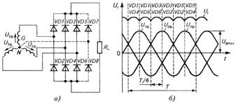 Рис. 2. Мостовая трехфазная схема выпрямления: а - электрическая схема; б - осциллограммы фазных и выпрямленного напряжений.