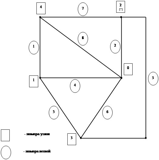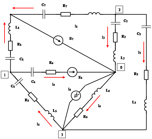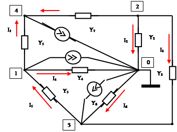 Узел с номером "0" полагаем "опорным", его потенциал - равным нулю, при этом направления токов действующих в ветвях, и направления источников тока выбираем произвольно.