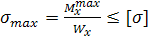 Деформация изгибающего момента обуславливает появление в материале нормальное напряжение, которое не должно быть больше допустимого [σ]: