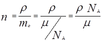 где где μ- молярная масса вещества. NA =6,02*1023 моль-1 - число Авогадро (число атомов или молекул в одном моле вещества) Так как - концентрация атомов или молекул вещества, то из формулы 5) следует: