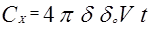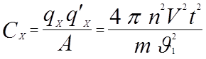 Предположим, что в природе существуют некие заряды qx , которые создают Х-поле. Также предположим, что любое тело способно накапливать эти заряды (qx ), то есть обладать Х-ёмкостью, тогда по аналогии, глядя на выражение электроёмкости 9), можно попытаться получить формулу для Х-ёмкости. Так как формула 5) отличается от формулы 4) дополнительным множителем t и появлением вместо линейных размеров объёмных, то можем предположить, что Х-ёмкость отличается от электроёмкости 9) теми же параметрами: