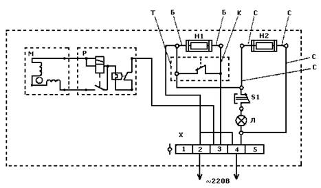 М — компрессор ХКВ6- 1ЛБУ; Р — реле Р1: Т — терморегулятор Т130; S — выключатель ВОК-2; Л - лампа РН 220-15-1: Н1, Н2 — электронагреватели; Х — распределительная колодка; Б, К, С — цвет проводов (К — коричневый, Б — белый, С — синий); 1, 2, 3, 4, 5 — номера на распределительной колодке