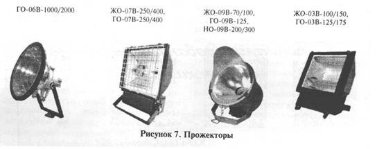 В настоящее время ОАО «Ватра» выпускает широкую гамму прожекторов для освещения различных промышленных объектов. Это современные высокоэффективные прожекторы с металлогалогенными и натриевыми лампами мощностью от 100 до 2000 Вт узкого и широкого светораспределения типа ЖО-01-250/400, ЖО-02В-150/250, ЖО-03В-100/150, ЖО-04В-250/400/1000, ЖО-07В-250/400, ГО-06В-1000/2000, ГО-07-1000/2000, ГО-07В-250/400, ГО-15В-1000, ЖО-09В-70/100. Все эти прожекторы выпускаются с различными источниками света с ИЗУ или БМП (рис. 7).