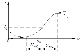 При реализации некоторых устройств аппаратуры связи, работа которых основана на использовании нелинейных электрических цепей (элементов) и бигармоническом воздействии, часто возникает практическая ситуация, когда амплитуда одного из напряжений значительно больше другого. Например, в преобразователе частоты супергетеродинного радиоприемного устройства амплитуда преобразуемого сигнала значительно меньше амплитуды напряжения местного источника гармонического напряжения (гетеродином). В этих условиях НЭ для сигнала с малой амплитудой выступает в качестве параметрического элемента. Графическая иллюстрация такого режима представлена на рисунке 9.
